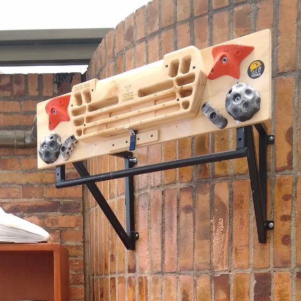 Estructura 2 para Hangboard: Diseñada específicamente para aquellos espacios de pared a pared. Sus 2 barras funcionan para hacer entrenamientos de pull ups, trx y demás. Son removibles y pueden anclarse fácilmente a la pared. Viene con ganchos de sujeción para colgar tu hang board y entrenar en ella.